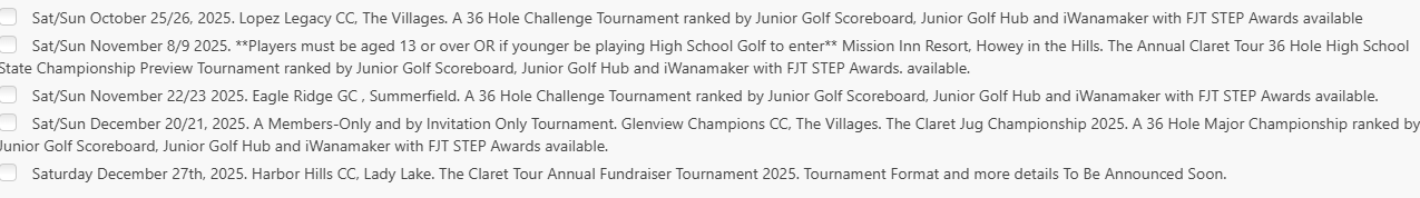 The Lopez Legacy GC Challenge Tournament- Player Information (Day 1) Saturday October 25th, 2025 – Good morning everyone and thank you for your player registration for this weekend’s 36 Hole Lopez Legacy Junior Challenge Tournament. We are very much looking forward to welcoming you tomorrow to what is, undoubtedly one of the best championship venues we play, Lopez Legacy GC in The Villages. Venue information and directions are found by clicking HERE This ranked tournament will attract player rankings points from iWanamaker rankings, Junior Golf Scoreboard and Junior Golf Hub (Click HERE and read Section 9a and 9b for T&C’s relating to player rankings) FJT STEP Exemption Awards are also available to qualifying players in… Read More