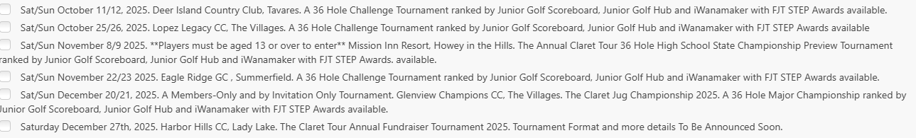 The Claret Tour Glenview Champions Challenge – Final Day Sunday Player Information. - The Glenview Champions 36 Hole Challenge Tournament 2025 We are very much looking forward to seeing you all back at Glenview Champions in the Villages tomorrow for the concluding day of another exciting weekend of junior golf competition. Please find below player information including pairings. These have now been added to the CJGT scoring app. Players, please do remember this is the halfway stage for everyone and there is ALWAYS something to be gained and learned for every player in the field! Tournament golf improvement requires your constant focus and your belief that each time you tee it up you… Read More