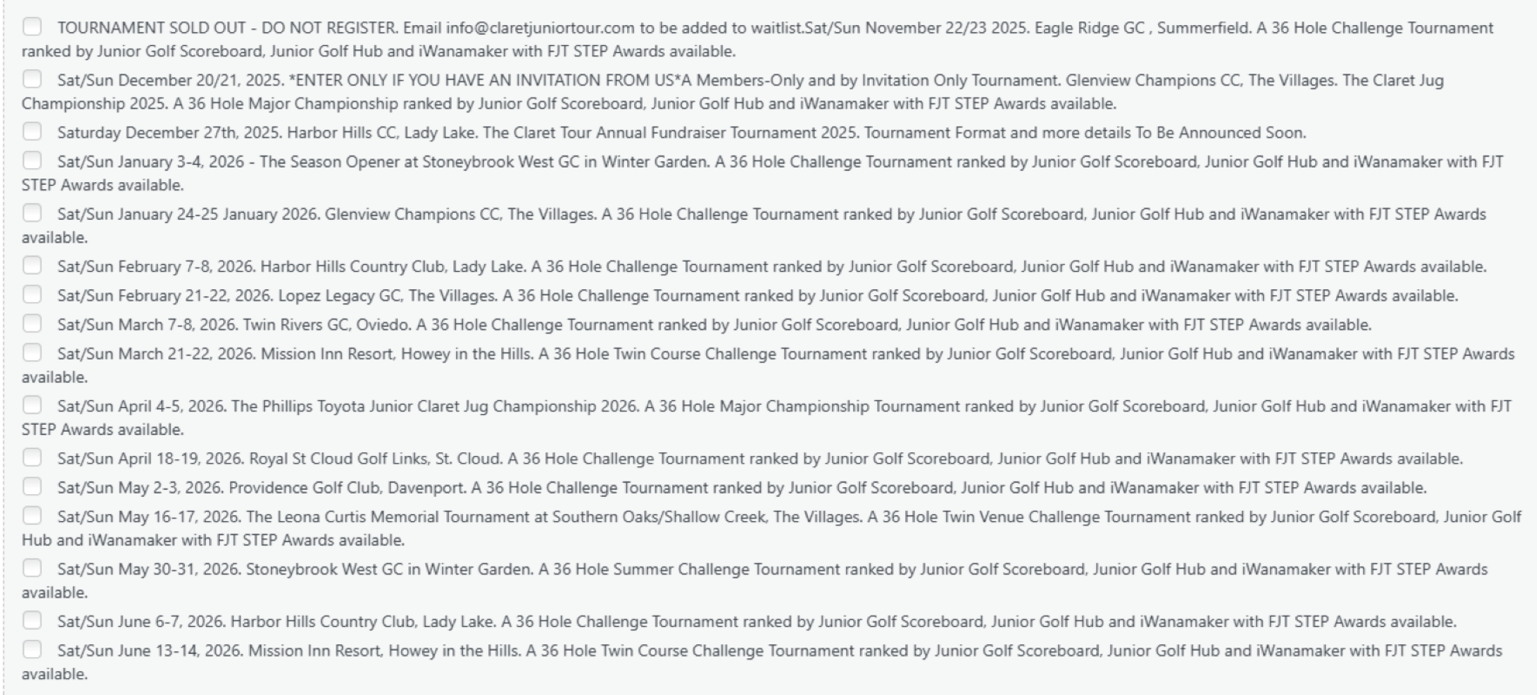 The Claret Tour at Eagle Ridge GC – The Eagle Ridge Junior Tournament Challenge 2025 – Thank you for your player registration for this weekend’s Junior Tournament Challenge at Eagle Ridge GC in Summerfield. This a 36-Hole Junior Challenge Tournament and venue information and directions are found by clicking HERE This Nationally ranked tournament will attract player rankings points from iWanamaker rankings, Junior Golf Scoreboard and Junior Golf Hub (Click HERE and read Section 9a and 9b for our T&C’s relating to player rankings) FJT STEP Exemption Awards are also available to qualifying players, who hold current annual membership of the tour, in this tournament. TEE TIMES and PAIRINGS: Day 1 pairings are shown below and… Read More