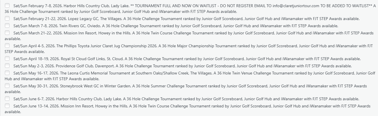 The Claret Junior Tournament at Glenview Champions CC on 1/24 – Advance Tournament Information for players. – This coming weekend (January 24-25) we will once again make our way to the exceptional Glenview Champions Country Club in The Villages for the 2026 Winter Challenge 36 Hole Tournament. Thank you for your player registration for this event, we look forward to welcoming you to this Nationally Ranked Championship, the second tournament event of our 2026 Season. Please note that there are 3 x 9 hole Championship Courses at Glenview Champions (Talley Ho, Fox Run and Stirrup Cup) and our rotation will have us playing all 3 of them. Our rotation is as follows: Saturday January 24th – Talley… Read More