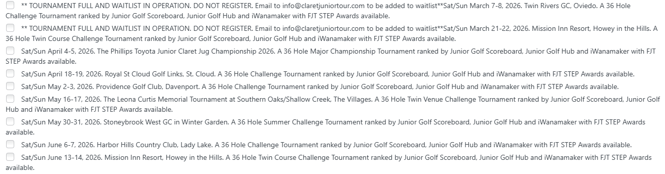 The Claret Golf Tour at Lopez Legacy CC on February 21-22. Advance Player Information. – Thank you for your player entry for our upcoming tournament on February 21-22 at Lopez Legacy Country Club in The Villages. We are very much looking forward to welcoming you to one of the best championship venues on our venue rota! Venue information and directions are found by clicking HERE This 36 Hole nationally ranked tournament will attract player rankings points from iWanamaker rankings, Junior Golf Scoreboard and Junior Golf Hub (Click HERE and read Section 9a and 9b for our T&C’s relating to player rankings) FJT STEP Exemption Awards are also available to qualifying players, who hold a current… Read More