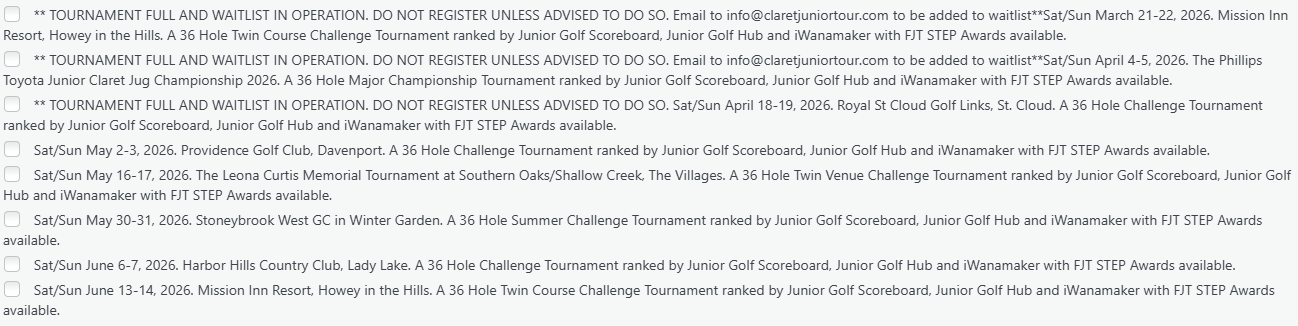 The Claret Tour at Twin Rivers GC in Oviedo – Advance Information for Players. – Thank you for your player entry for our upcoming tournament on March 7-8 at Twin Rivers GC in Oviedo, Florida. We are very much looking forward to having you with us as we make our first tournament visit to this exciting new venue. Venue information and directions are found by clicking HERE This 36 Hole nationally ranked tournament will attract player rankings points from iWanamaker rankings, Junior Golf Scoreboard and Junior Golf Hub (Click HERE and read Section 9a and 9b for our T&C’s relating to player rankings) FJT STEP Exemption Awards are also available to qualifying players, who must… Read More