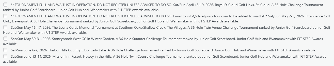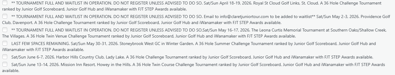The Mission Inn Two Course Junior Challenge Tournament – Day 1 Player Information – Thank you for your player entry for this weekend’s 36-Hole Challenge Tournament taking place at the renowned Mission Inn Resort in Howey in the Hills. Mission Inn is Florida’s most historic venue and hosts numerous Professional and Amateur tournament events each year. It is also, for the 15th year running, this year’s host venue for the FHSAA (Florida High School) State Championships and if you are a High School golfer, we do hope that you may get to return here in November to represent your school as a qualified player! Venue information can be found by clicking HERE Tomorrow, (Saturday… Read More